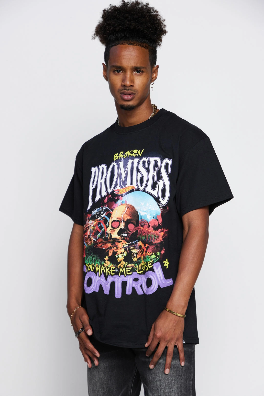 - Graphic features a Hot Wheels track with skull and scenic background, with the phrase “You make me lose control” in a combination of hand-written and balloon letters.Â