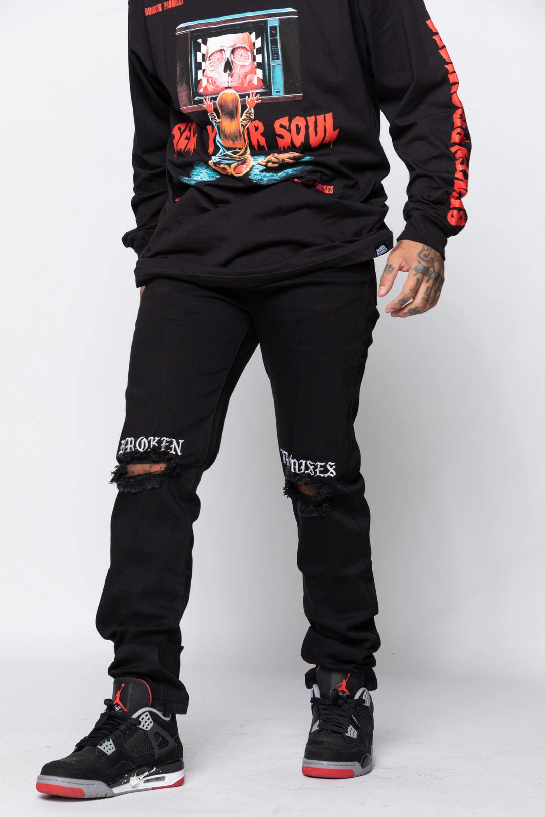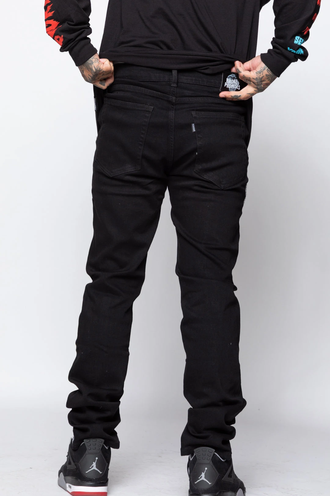 - White embroidery above knees reads “Broken Promises”